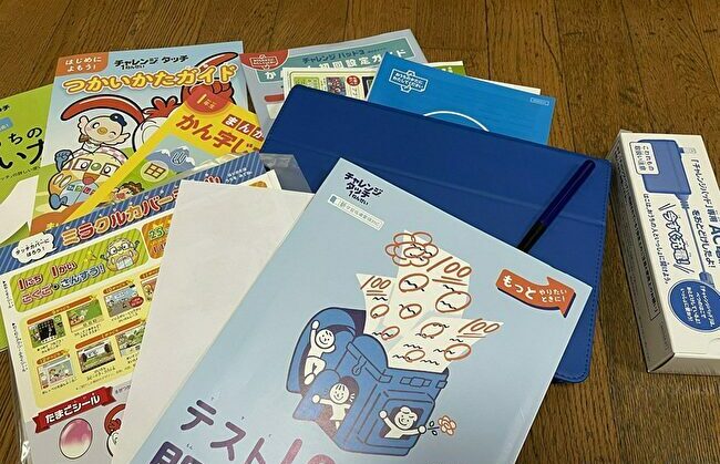 箱の中には、チャレンジタッチをするタブレット以外にも問題集や漢字辞典、使い方ガイドなどなど沢山のものが入っていました!