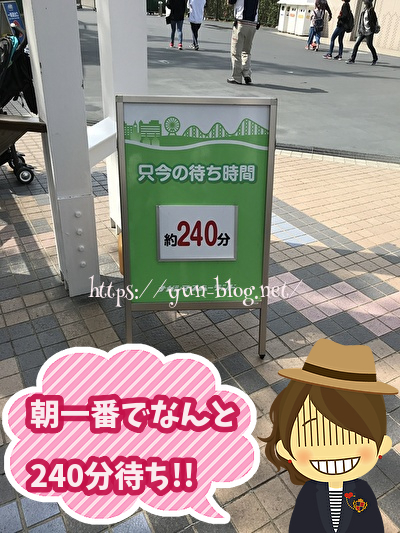 このときの混雑状況は、朝いちばんの開園してすぐくらいで(だいたい9時頃)いきなりの240分待ちでした!