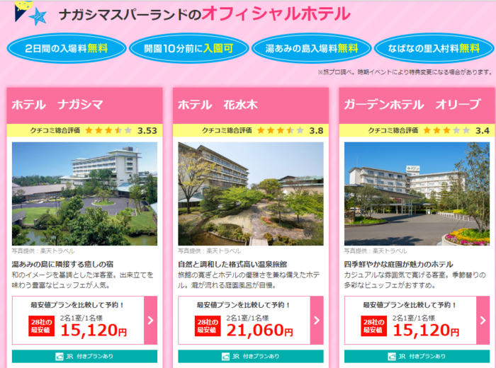 長島スパーランドのオフィシャルホテルの最安値で予約をするには、H.I.Sがおすすめです。