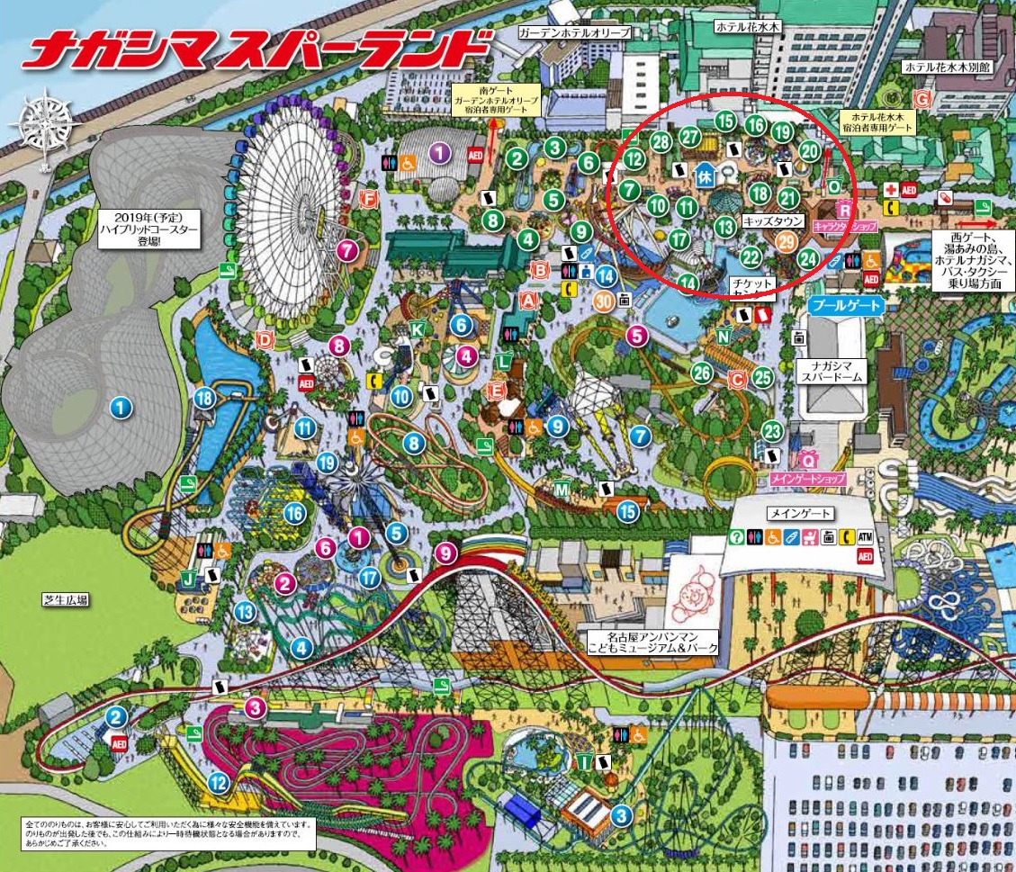 ナガシマスパーランドでは、キッズタウン(赤丸で囲った部分になります)というキッズが楽しめるエリアがあります