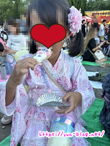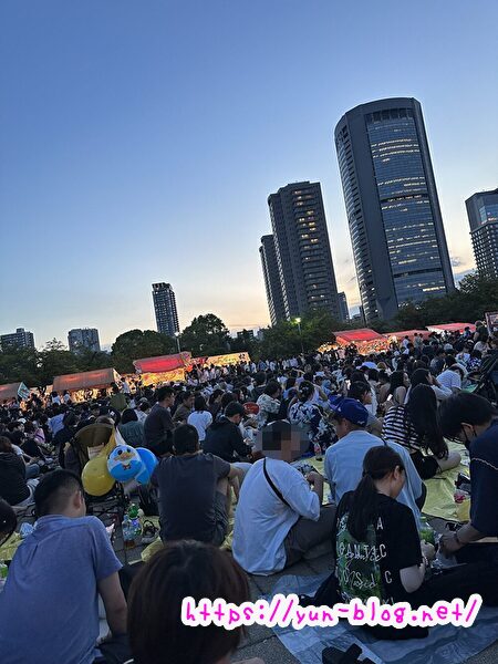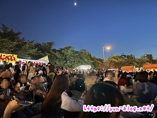 座る場所が無くなってきて、花火の時間が近づくとこの辺りはもう立ち見の人ですごいことになって、屋台に行くことも不可能になってきます